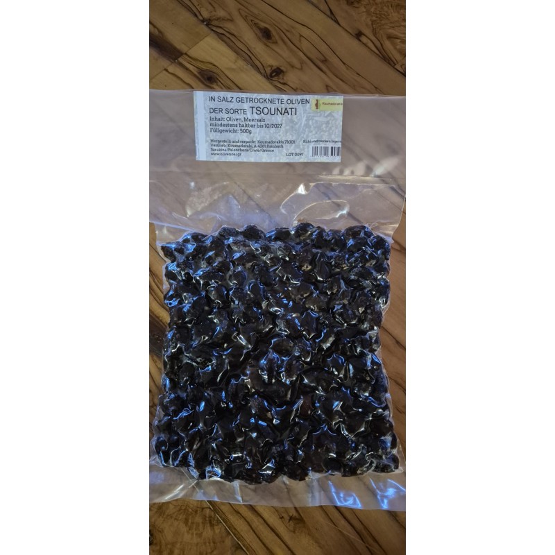 Oliven der Sorte Tsounati in Meersalz getrocknet, verpackt 500 gr